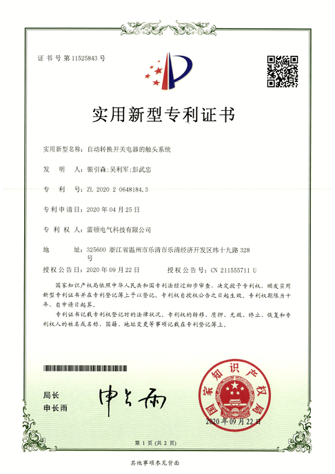 266[專利證書]自動轉(zhuǎn)換開關(guān)電器的觸頭系統(tǒng)(實(shí)用)
