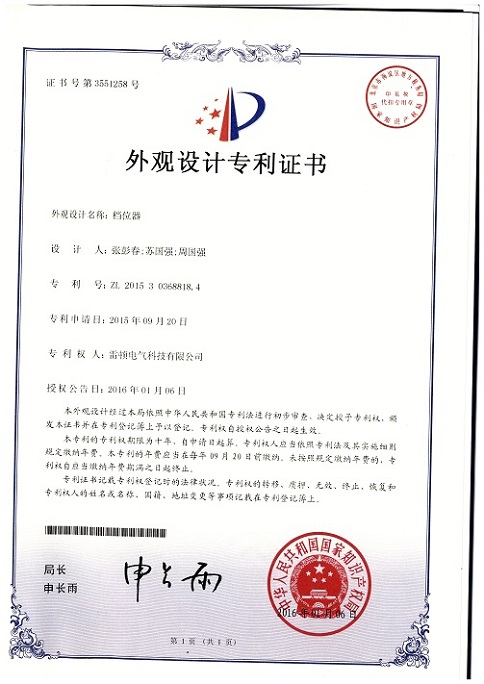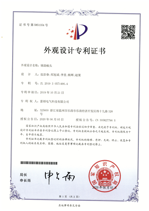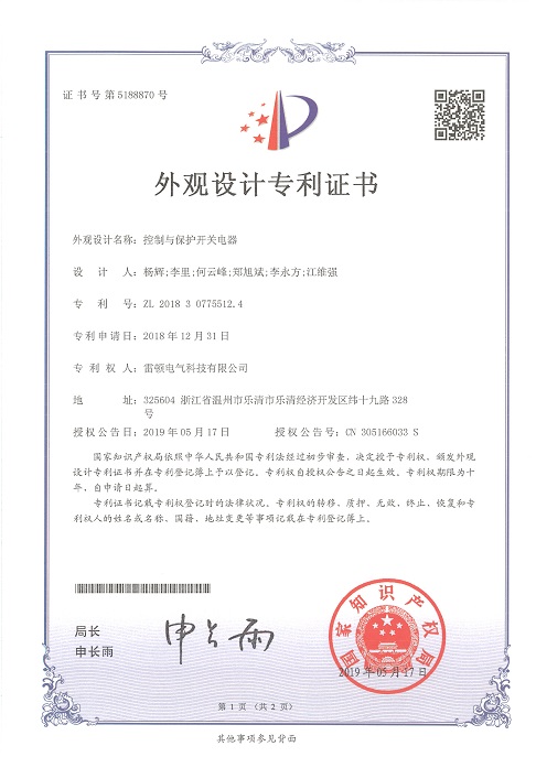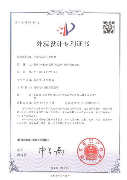 604[專利證書]控制與保護開關(guān)電器(外觀)