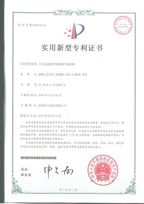 [專利證書]開關(guān)電器操作機構(gòu)的手柄結(jié)構(gòu)(實用)