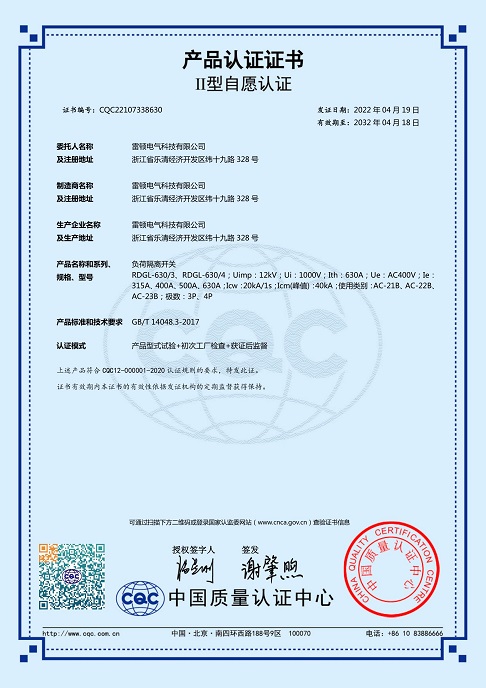 RDGL -63/3、RDGL-63/4 負(fù)荷隔離開關(guān)3C證書【CCC】
