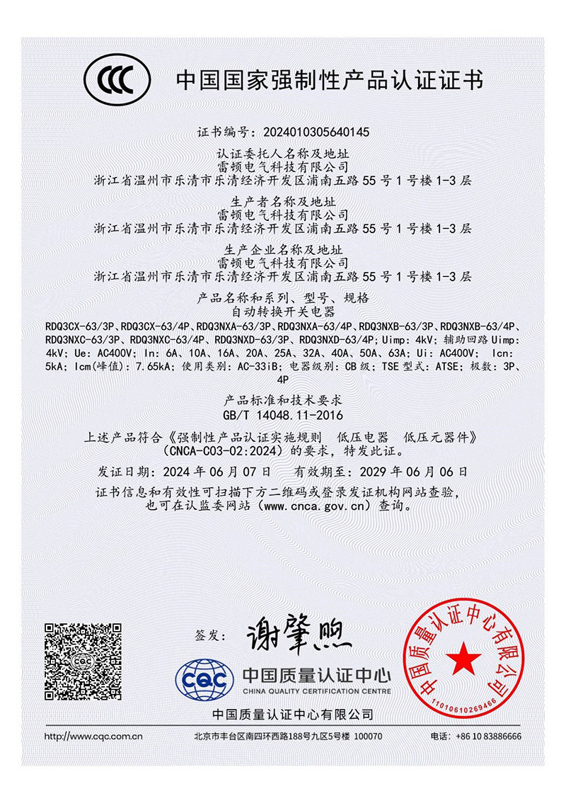 RDQ3CX-63/3P-4P、RDQ3CXA-63/3P-4P、RDQ3CXB-63/3P-4P、RDQ3CXC-63/3P-4P、RDQ3CXD-63/3P-4P自動(dòng)轉(zhuǎn)換開(kāi)關(guān)電器3C證書(shū)【CCC】