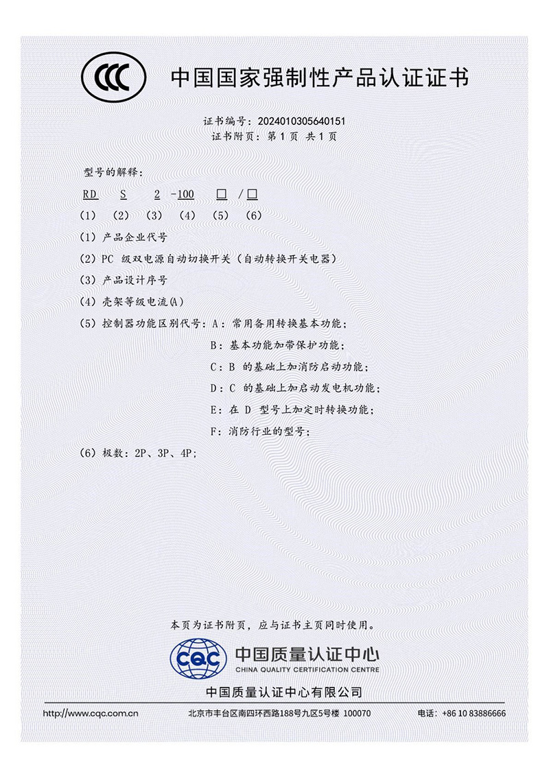 RDS2-100A、RDS2-100B、 RDS2-100C、RDS2-100D、RDS2- -100E、RDS2-100F自動(dòng)轉(zhuǎn)換開(kāi)關(guān)電器3C證書(shū)-2【CCC】