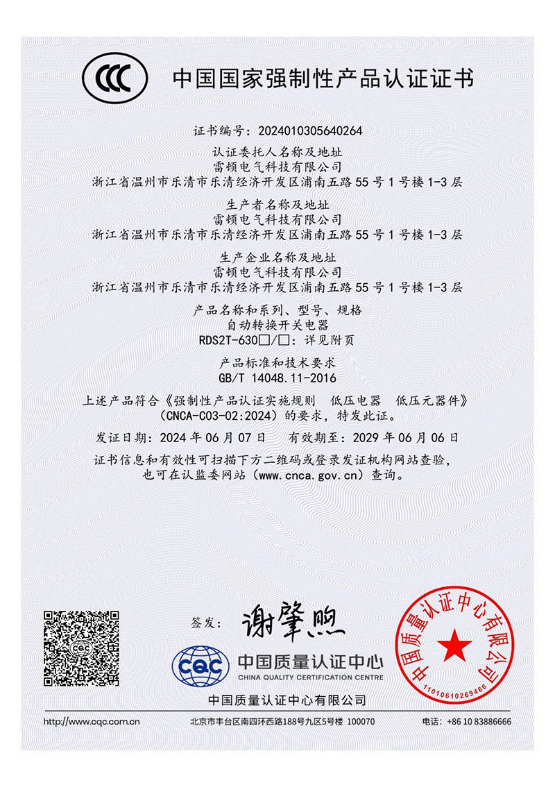 RDS2T-630□/□自動轉(zhuǎn)換開關(guān)電器3C證書【CCC】