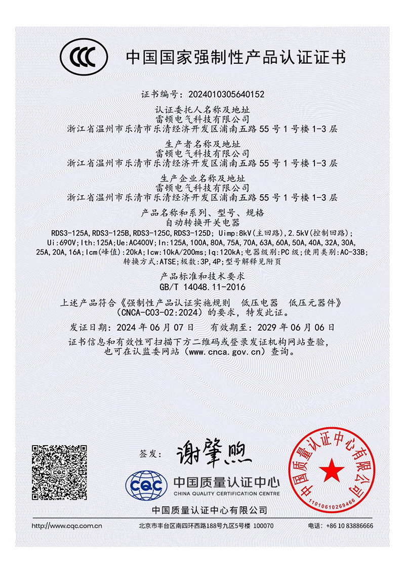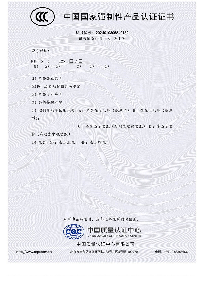 RDS3-125A, RDS3-125B, RDS3-125C, RDS3-125D自動(dòng)轉(zhuǎn)換開(kāi)關(guān)電器3C證書-2【CCC】