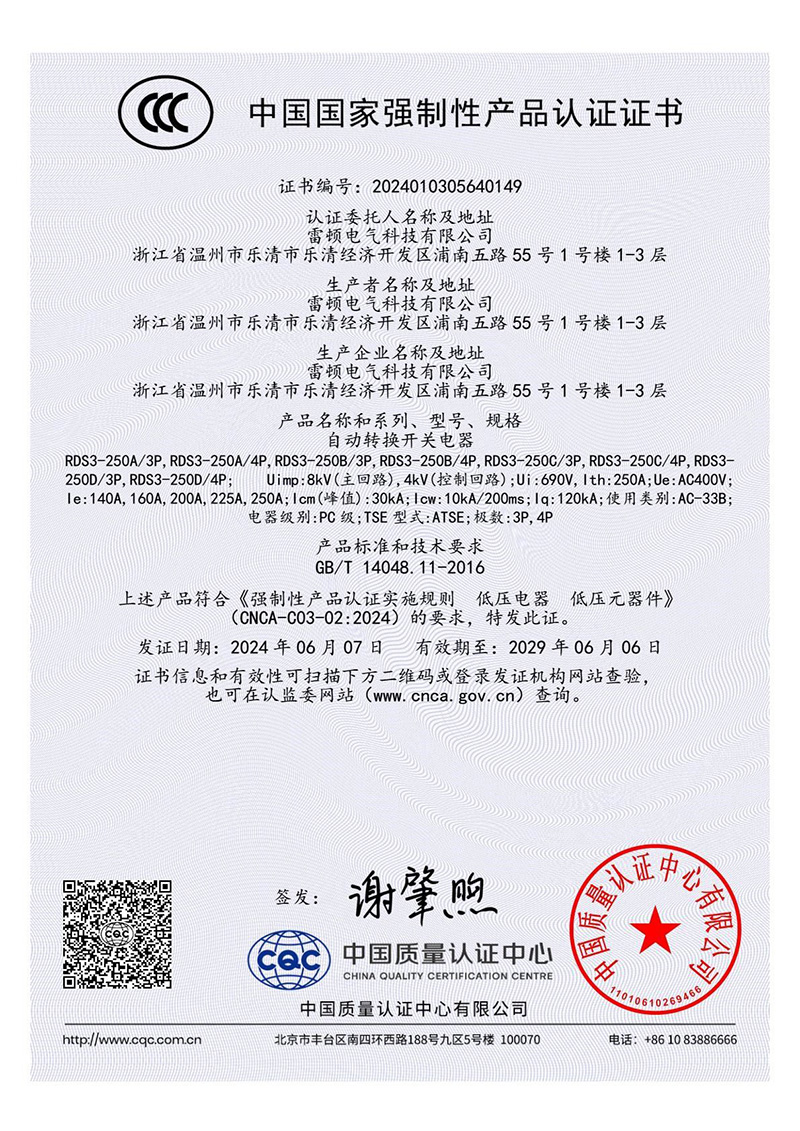 RDS3-250A/3P-4P, RDS3-250B/3P-4P, RDS3-250C/3P-4P, RDS3-250D/3P-4P自動(dòng)轉(zhuǎn)換開(kāi)關(guān)電器3C證書【CCC】