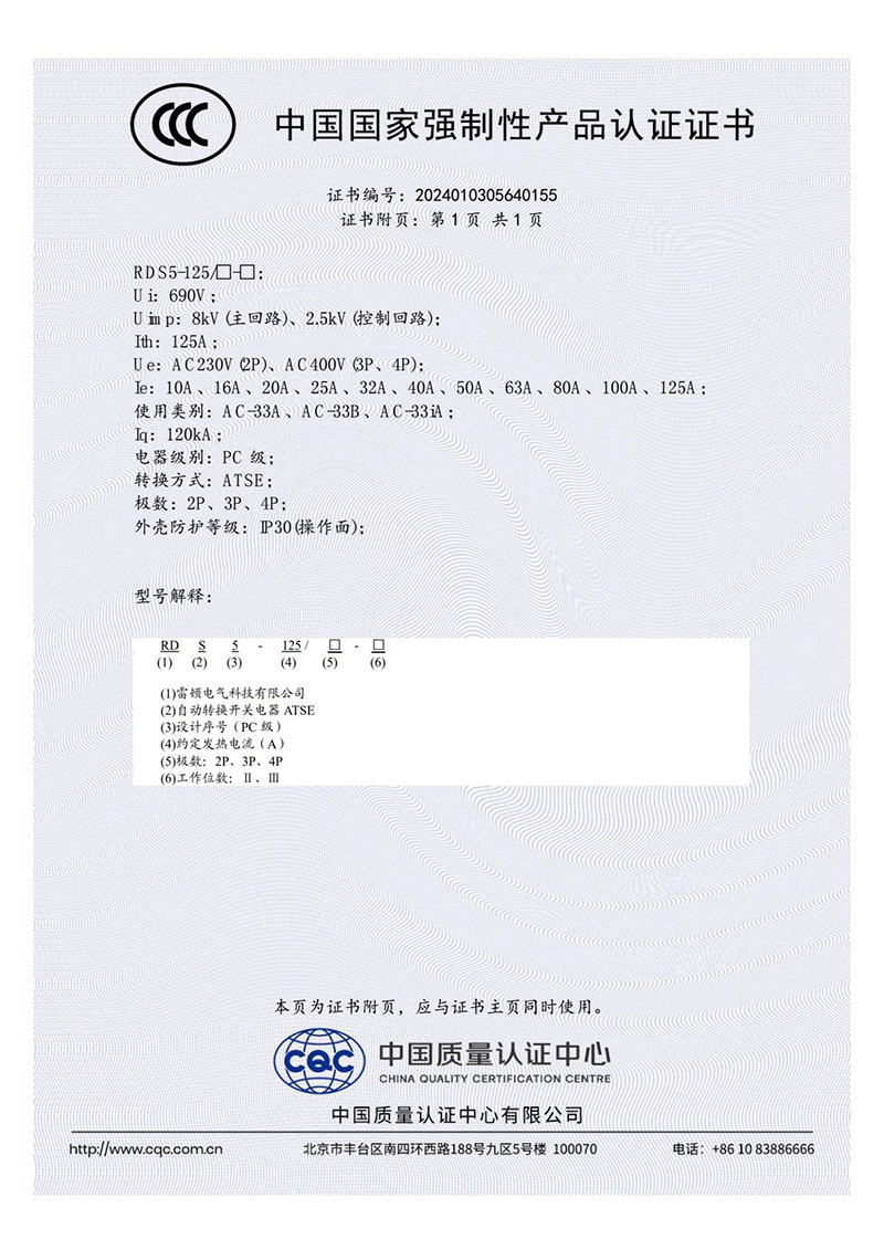 RDS5-125□/□自動(dòng)轉(zhuǎn)換開(kāi)關(guān)電器3C證書-2【CCC】