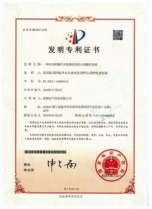 020[專利證書]一種自動轉(zhuǎn)換開關電器信息的云端操控系統(tǒng)(發(fā)明)