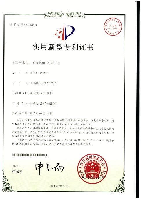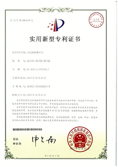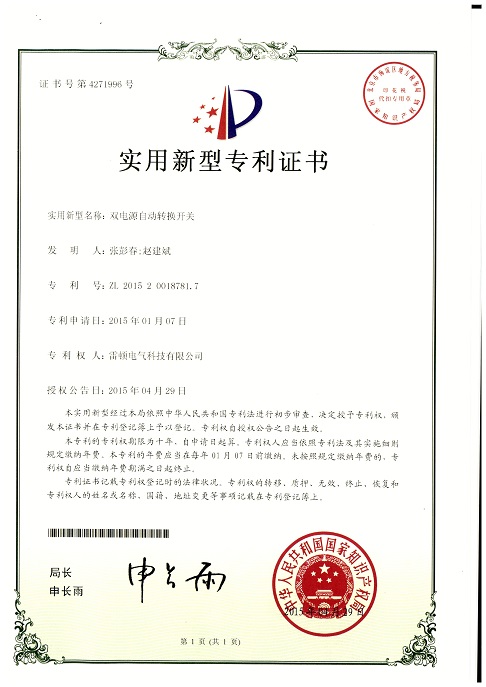 209[專(zhuān)利證書(shū)]雙電源轉(zhuǎn)換開(kāi)關(guān)(實(shí)用)