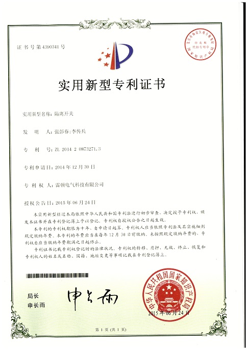 204[專(zhuān)利證書(shū)]隔離開(kāi)關(guān)(實(shí)用)