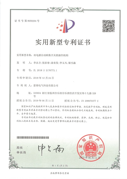 255[專利證書]雙電源自動(dòng)轉(zhuǎn)換開關(guān)的操作機(jī)構(gòu)(實(shí)用)