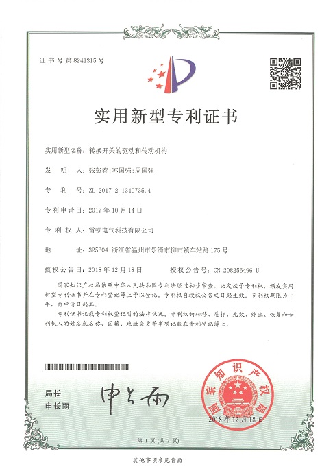 250[專利證書]轉(zhuǎn)換開關(guān)的驅(qū)動(dòng)和傳動(dòng)機(jī)構(gòu)(實(shí)用)