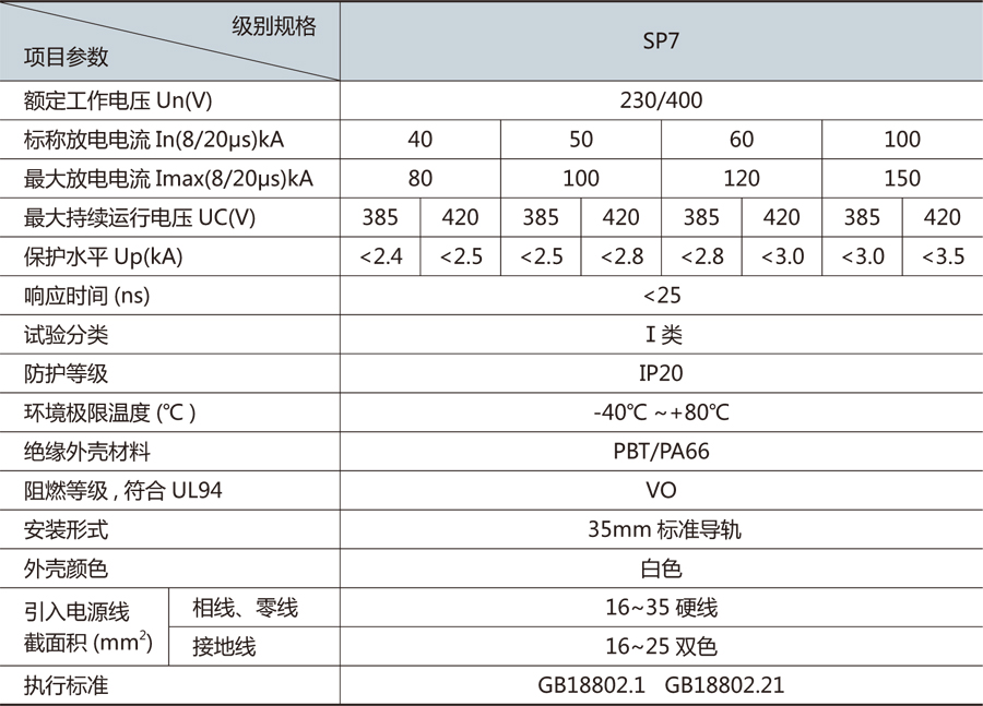 SP7系列電涌保護(hù)器,適用于交流50/60Hz,400V及以下的TN-S、TN-C、TN-C-S、 TT、 IT 等供電系統(tǒng),用在LPZOA與LPZO1區(qū)或LPZOB與LPZ1區(qū)的界面處的等電位連接,對(duì)電網(wǎng)因雷擊或浪涌進(jìn)行保護(hù)。