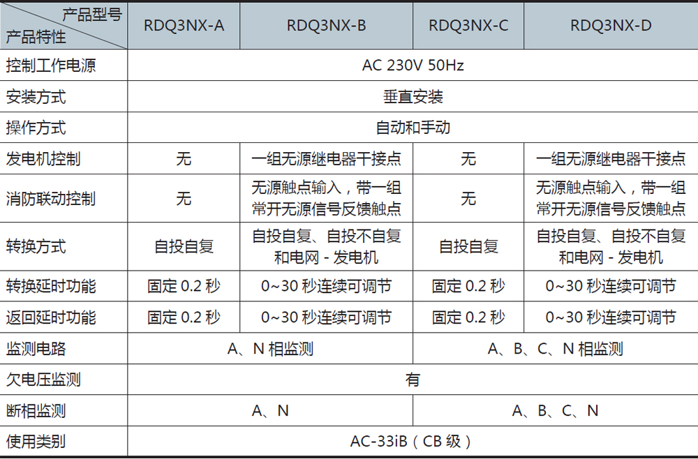 自動轉(zhuǎn)換開關(guān)電器根據(jù)工作電源的電壓狀態(tài),以及用戶所設(shè)置的工作方式,決定是否從一個電源轉(zhuǎn)向另一個電源。它的功能取決于其所配置的控制器,控制器包括A、B、C、D 四種型號的控制器,其具備的主要功能和特性如下表所示: