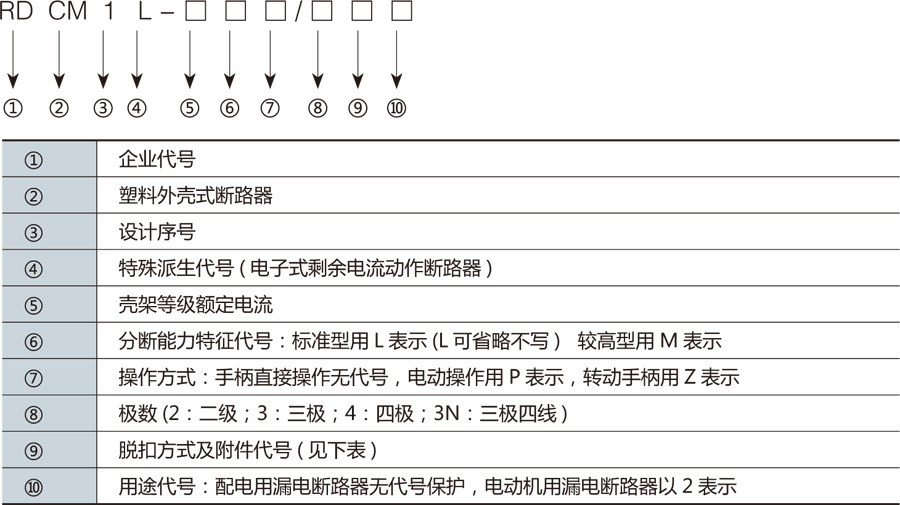 訂購(gòu)RDCM1L 系列斷路器應(yīng)注明產(chǎn)品型號(hào)、名稱、額定電壓、額定電流、漏電額定剩余動(dòng)作電流、漏電斷路器的漏電動(dòng)作時(shí)間、保護(hù)種類( 配電保護(hù),電