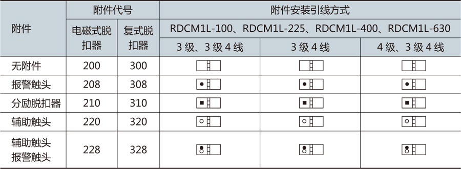 ● 按附件種類分:報(bào)警觸頭、輔助觸頭、分勵(lì)脫扣器、欠電壓脫扣器