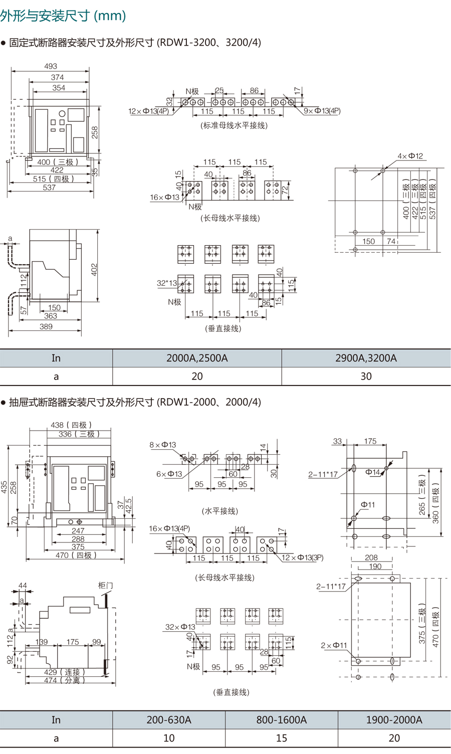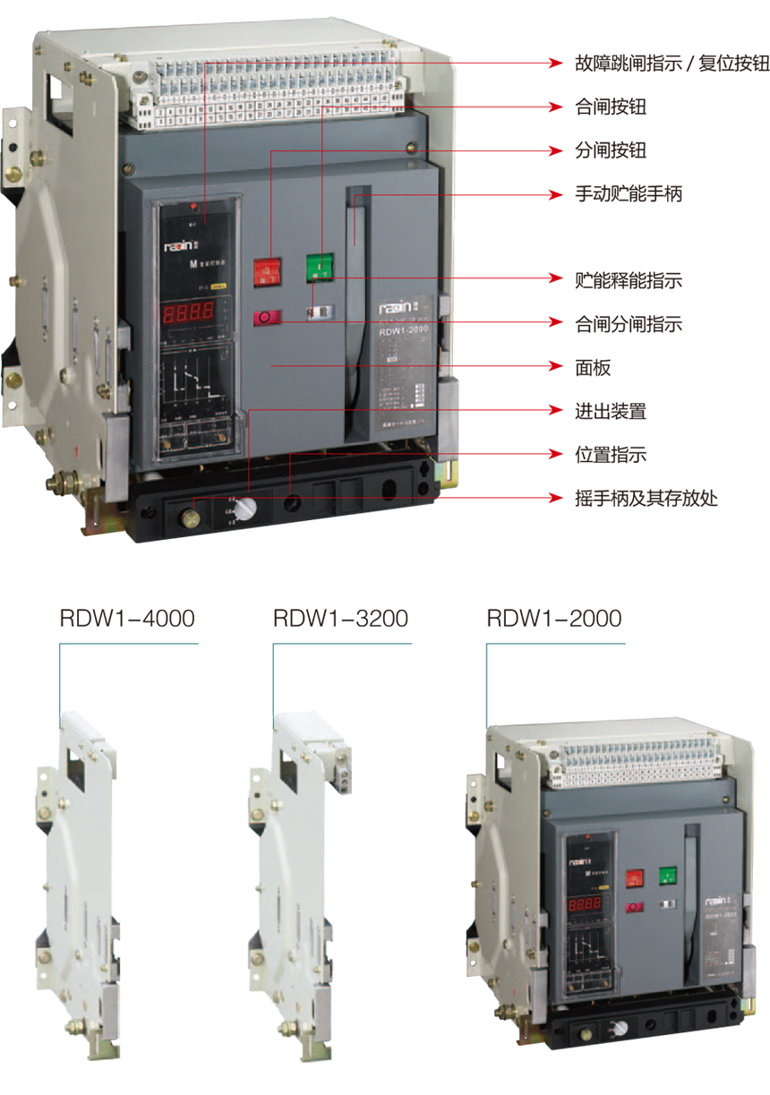 RDW1 系列智能型萬(wàn)能式斷路器用于控制和保護(hù)低壓配電網(wǎng)絡(luò)。斷路器具有過(guò)載、短路和欠電壓保護(hù)功能,一般安裝在低壓配電柜中作主開(kāi)關(guān)起總保護(hù)作用。額定電流4000A 及以下的斷路器,還可作電動(dòng)機(jī)不頻繁起動(dòng)之用。