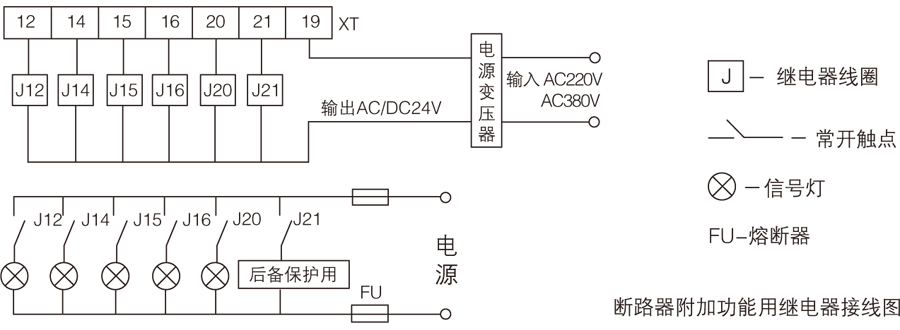 1) 控制器訊號(hào)輸出通過(guò)端子12、14~16、20、21 帶動(dòng)外附繼電器J 對(duì)外輸出接點(diǎn)動(dòng)作訊號(hào)。