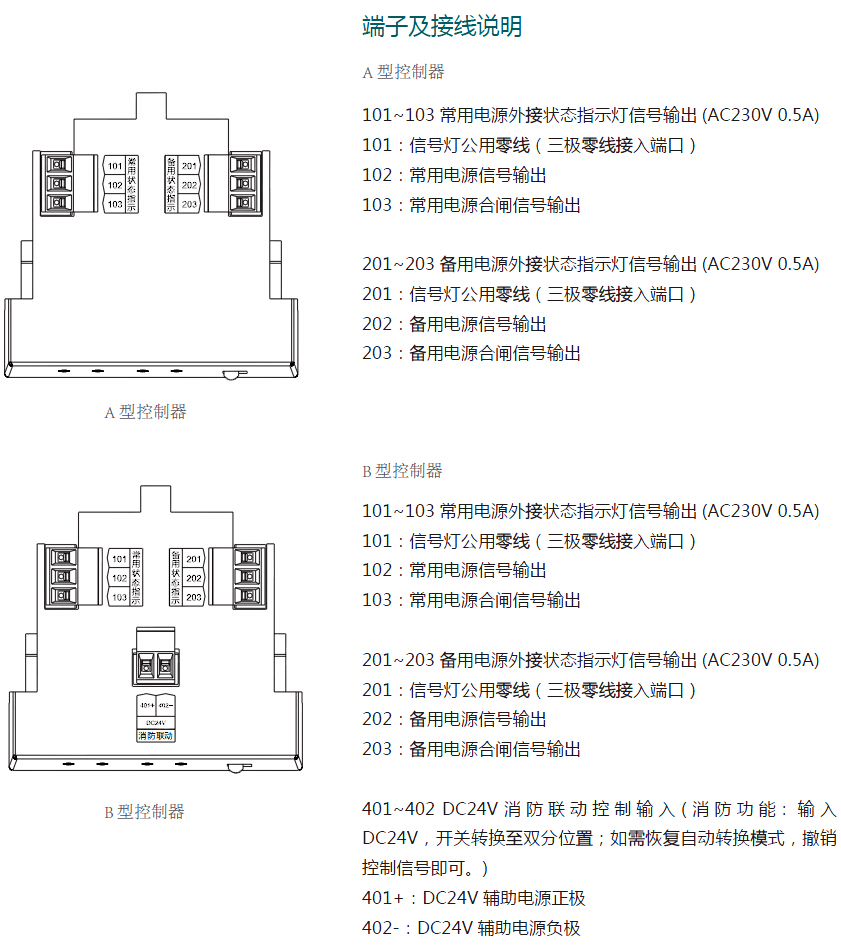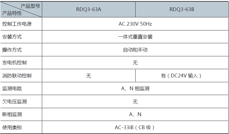 自動轉(zhuǎn)換開關(guān)電器根據(jù)工作電源的電壓狀態(tài),以及用戶所設(shè)置的工作方式,決定是否從一個電源轉(zhuǎn)向另一個電源。它的功能取決于其所配置的控制器,控制器包括A、B 兩種型號的控制器,其具備的主要功能和特性如下表所示: