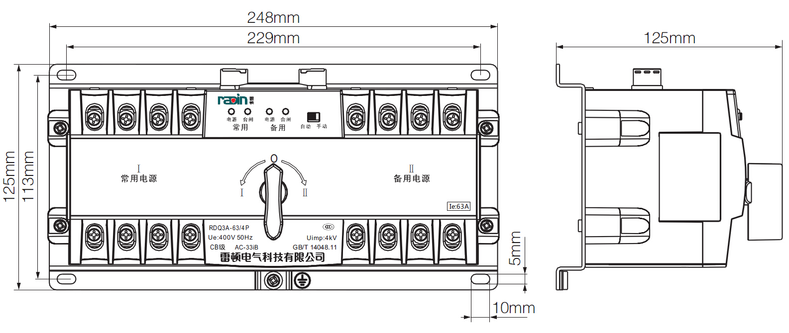 RDQ3-63A/B 屬于CB 級自動轉(zhuǎn)換開關(guān)電器,主要適用于交流50Hz,額定電壓400V,額定工作電流不大于63A 的兩路中性點接地電源系統(tǒng)中,因一路電源發(fā)生異常而進(jìn)行電源之間的轉(zhuǎn)換,保證其供電的可靠性和安全性。